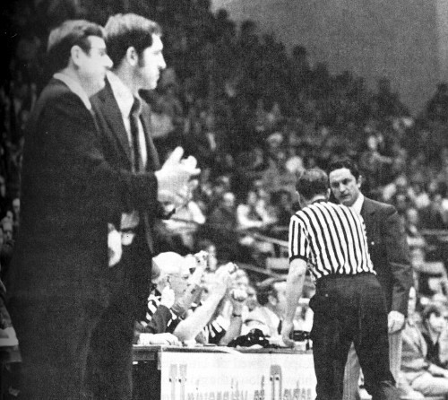 UK Assistant Coaches Gale Catlett and Joe Hall stand by as Al McGuire speaks to the referee