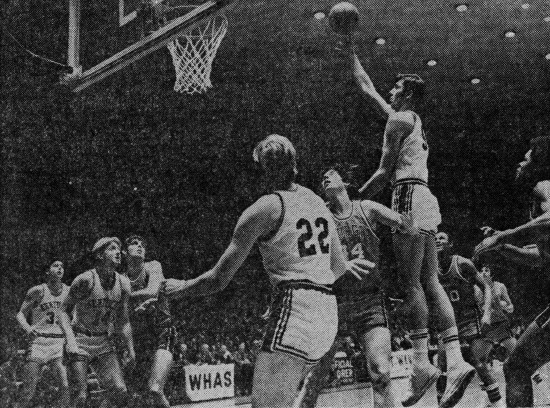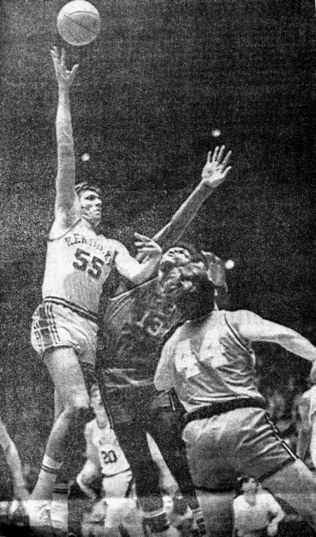 Kevin Grevey (#35) scores ahead of Mike Flynn (#24) and Georgia's Dick Toth (#44), Gino Gianfrancesco (#41) and Ronnie Hogue (#40)