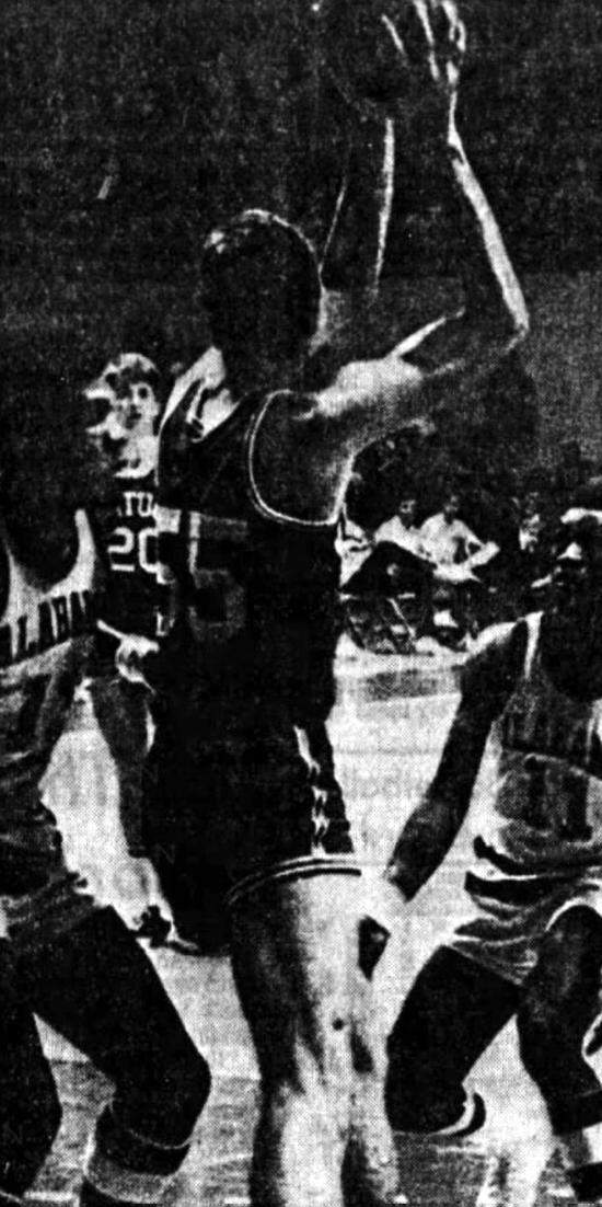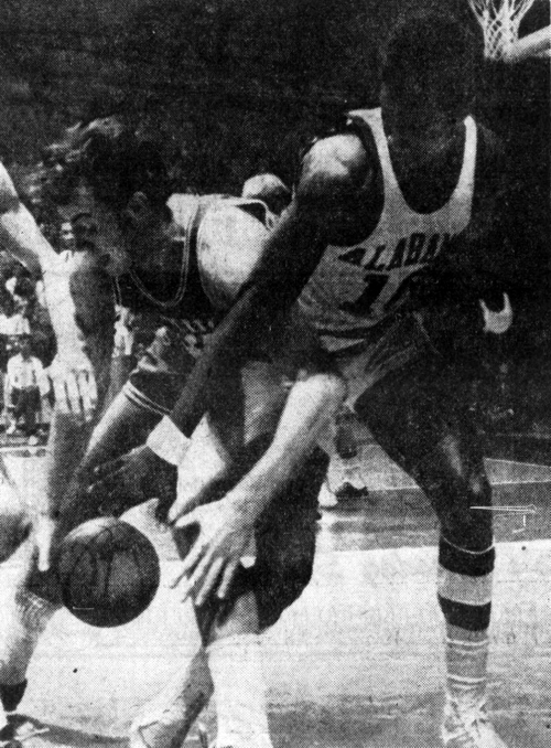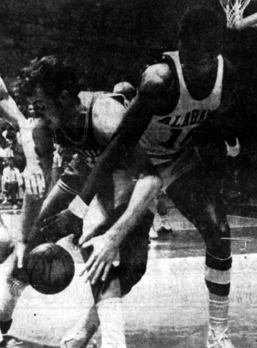 Kevin Grevey tries to keep the ball away from Alabama's Charles Cleveland