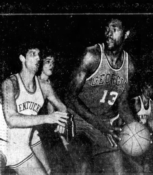 During the first half, Georgia fans were treated to 26 minutes of exciting basketball and a scoring duel between Bulldog center Tim Bassett and Wildcat forward Kevin Grevey.