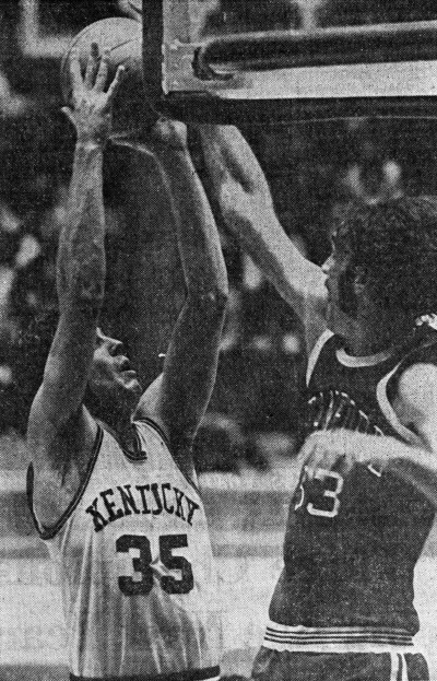 Kevin Grevey (#35) is defended by Stanford's Rich Kelley