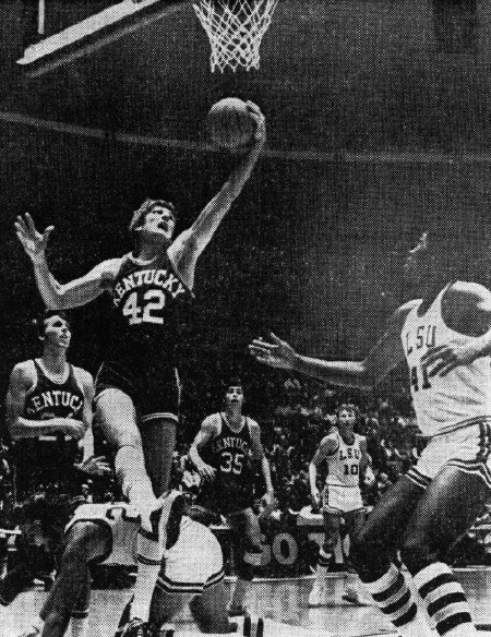 Bob Guyette (#42) makes his way over LSU's Wade Evans en route to scores two of his career high 26 points. Mike Flynn (#24), Kevin Grevey (#35), Eddie Palubinskas (#10) and Collis Temple (#41) look on