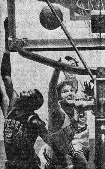 Mike Flynn dribbles out of traffic while Jimmy Dan Conner (#20) avoid a fallen Ole Miss player. Mississippi's Fred Cox (#21) and Bob Guyette look on from the baseline
