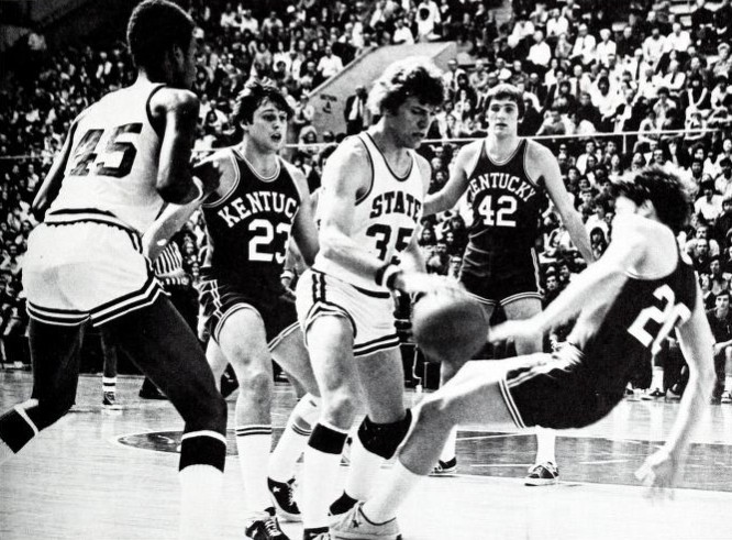 MSU's Rich Knarr (#35) runs into Jimmy Dan Conner (#20) while Jerry Hale (#23) and Bob Guyette (#42) look on.