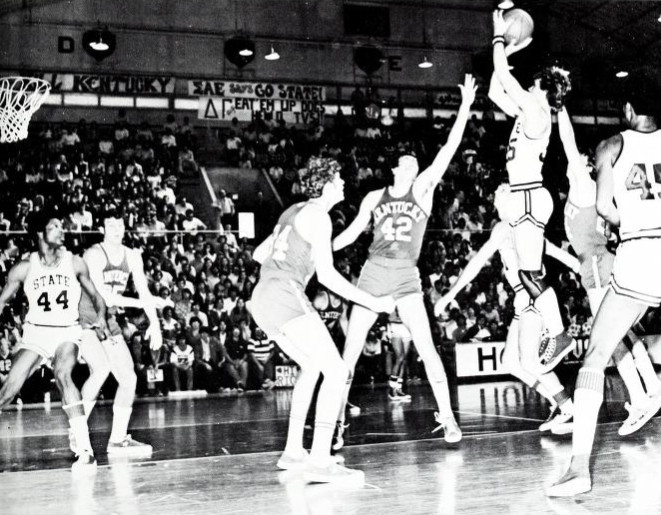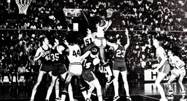 Action fro the game. G.J. Smith (#34) and Bob Guyette (#42) watch Rich Knarr shoot