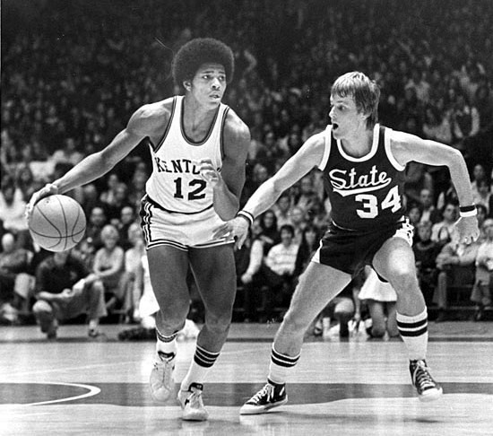 Bob Guyette (#45) scores inside while Rick Robey (#53) looks to rebound