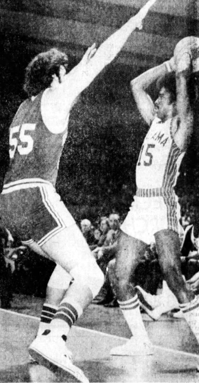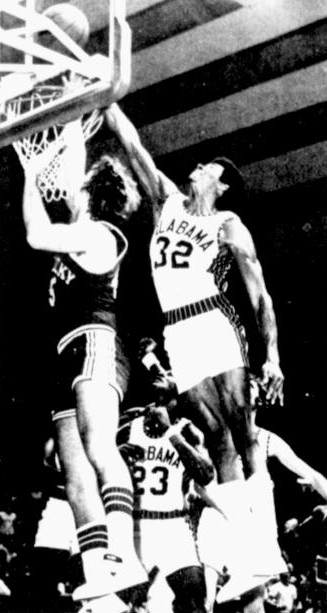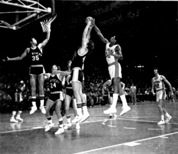 Bob Guyette grabs a rebound while being challenged by Alabama's Charles "Boonie" Russell (#32). Kevin Grevey (#35) and Mike Flynn (#24) watch from under the basket while Alabama's Johnny Dill (#22) looks on from the perimeter
