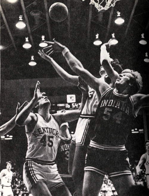 Bob Guyette (#45) looks on as Rick Robey battles IU's Kent Benson (#54) for a rebound