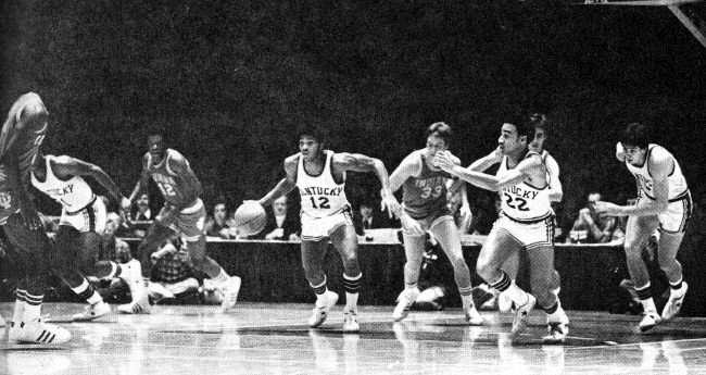 Jack Givens (#21) battles IU's Bobby Wilkerson (#20) while Bob Fowler (#44) and IU's Kent Benson (#54) look on