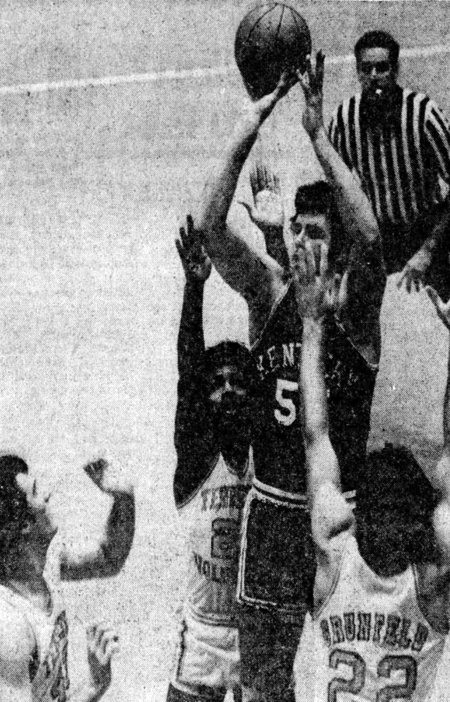 UT's Ernie Grunfeld looks to pass while guarded by UK's Merion Haskins (#30)