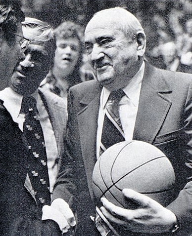 Former UK coach Adolph Rupp accepts the game ball after the win