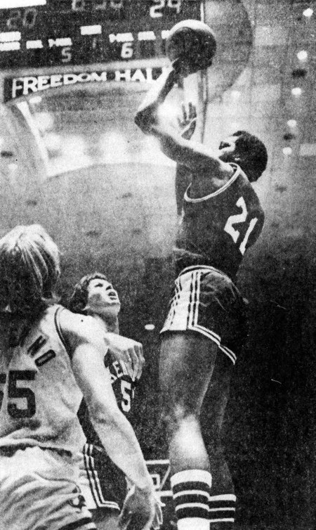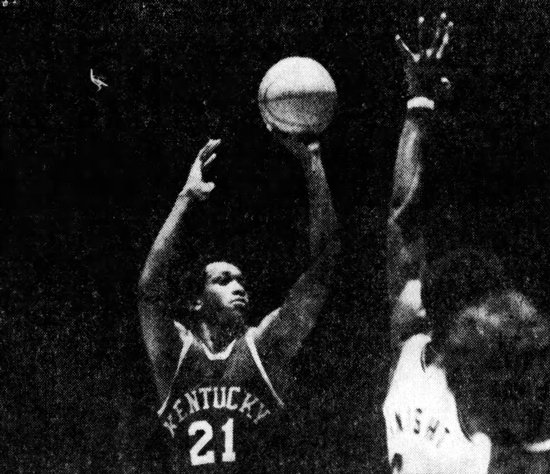 Notre Dame's Bill Paterno (#55) and UK's Rick Robey watch was jack Givens (#21) shoots