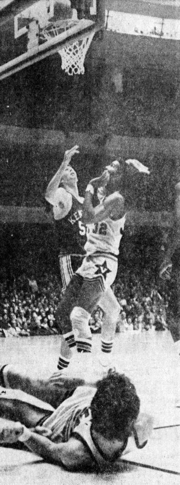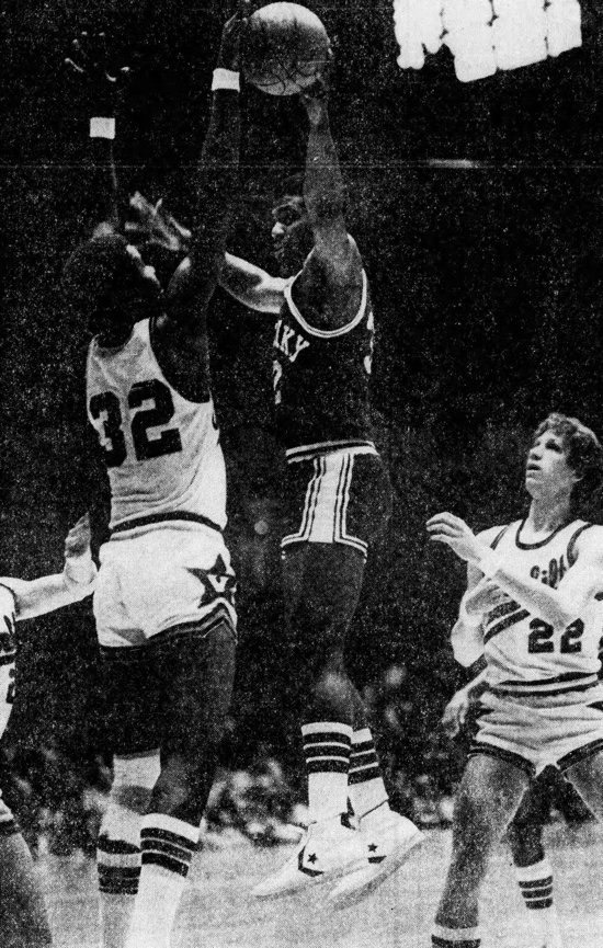 Rick Robey and Vanderbilt's John Sneed (#32) watch the ball fall through the hoop after Mark Elliott had collided with Merion Haskins