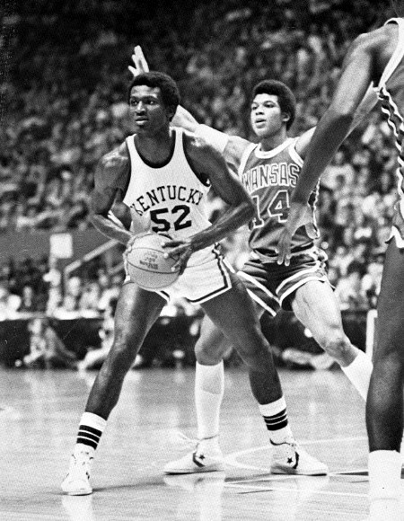 Darnell Valentine (#14) shoots over Kyle Macy (#4)