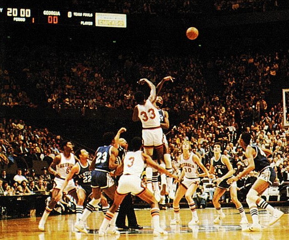 Lavon Williams (obscured by Georgia player) tips off the game