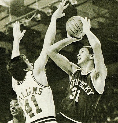 Sam Bowie(#31) shoots over Duke's Allen Williams (#41)