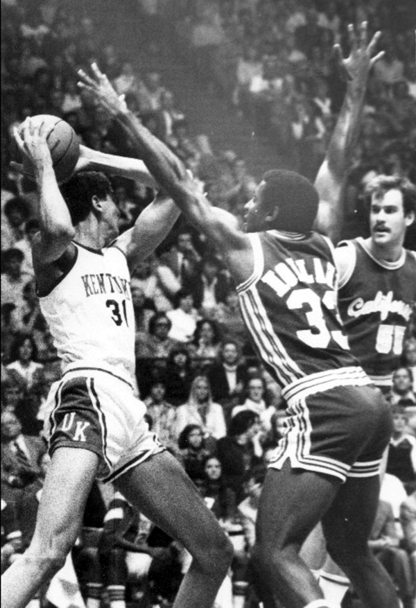 Sam Bowie (#31) is guarded by Cal's Mel Holland (#33)