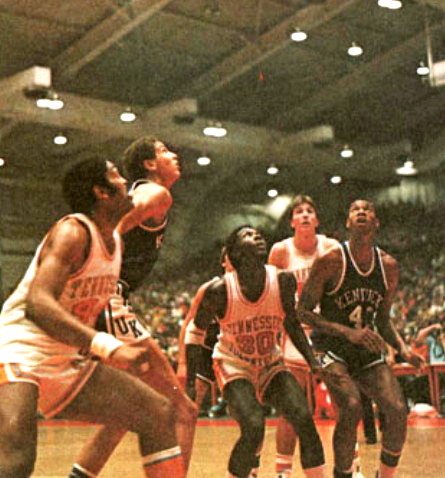 Sam Bowie and Fred Cowan wait for the rebound with UT's Gary Carter and Howard Wood