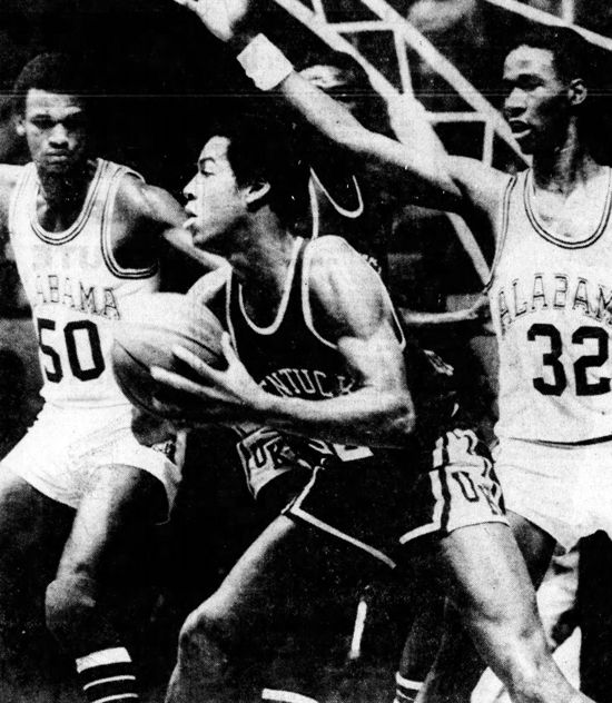 Derrick Hord looks to pass while defended by Alabama's Phillip Lockett (#50) and Ken Johnson (#32)