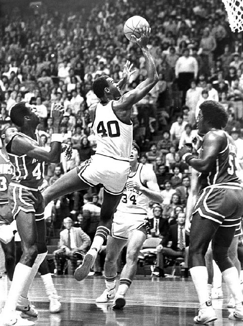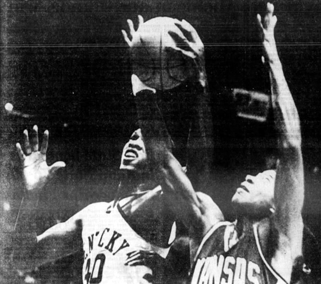 Fred Cowan fights Kansas' Darnell Valentine for a rebound