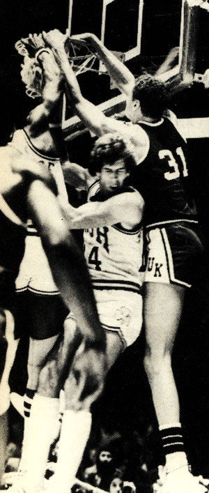 Sam Bowie (#31) dunks over Notre Dame's Kelly Tripucka and Orlando Woolridge