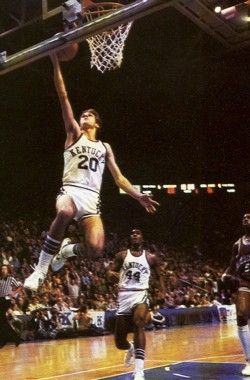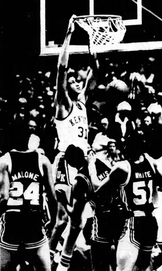 Sam Bowie (#31) dunks over MSU's Terry Lewis (#32) while Jeff Malone (#24) and Ron White (#51) can only watch
