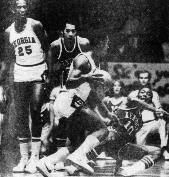 Georgia's Eric Marbury tries to take advantage of a Dirk Minniefield (#10) slip while Derrick Hord prepares to give help