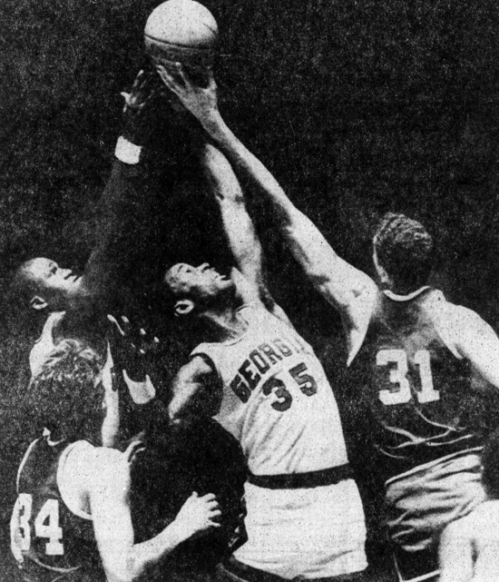 Sam Bowie (#31) stretches for a rebound with Georgia's Terry Fair (#35) and Dominique Wilkins