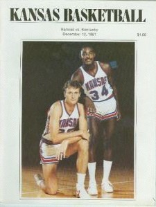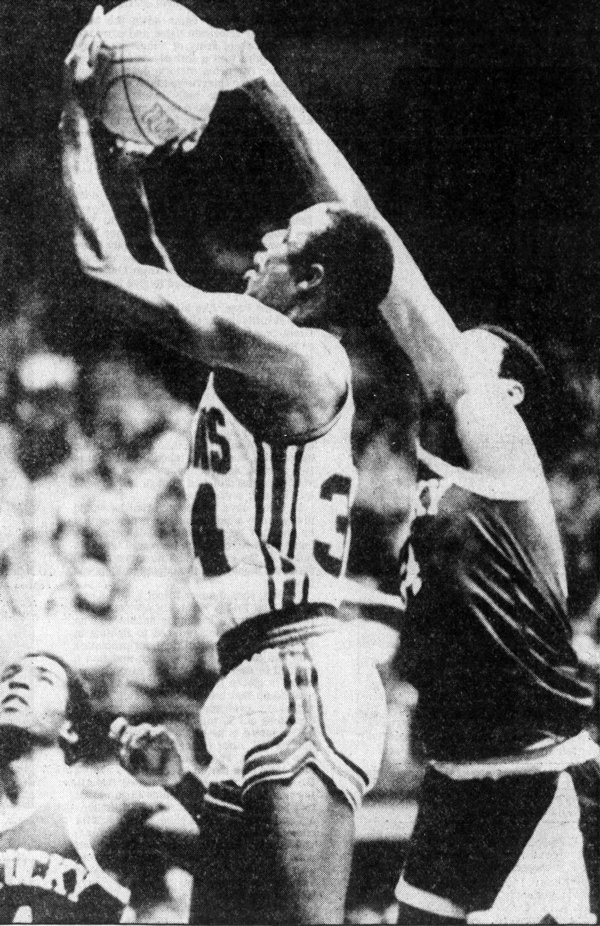 Melvin Turpin blocks the shot of Kansas' Tony Guy