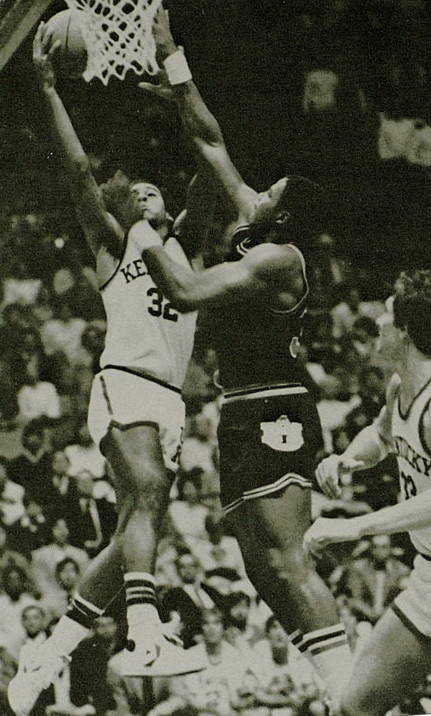 Derrick Hord (#32) attacks the basket while defended by Charles Barkley