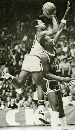 Jim Master (#20) shoots a left-handed layup while Charles Hurt (#44) looks on
