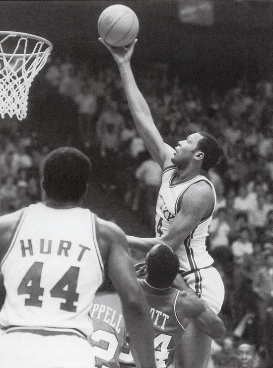 Melvin Turpin (#54) lays the ball up over McNatt and Doug Chappell while Charles Hurt (#44) looks on
