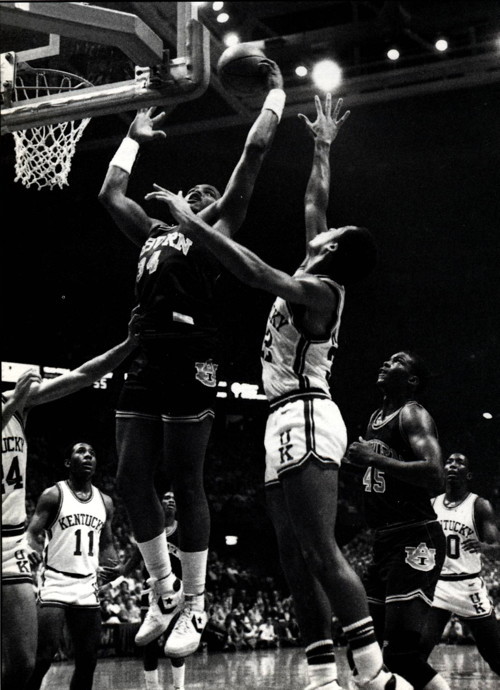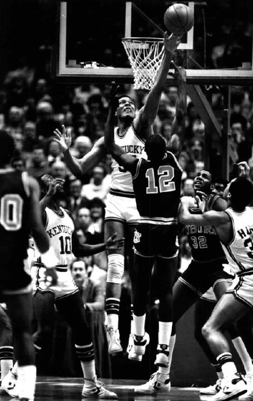 Melvin Turpin (#54) blocks the shot of Auburn's Odell Mosteller (#12)