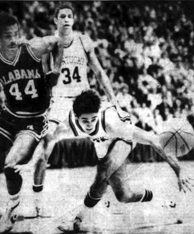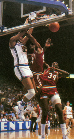 Melvin Turpin tips the ball away from Alabama's Bobby Lee Hurt while Kenny Walker (#34) defends the goal