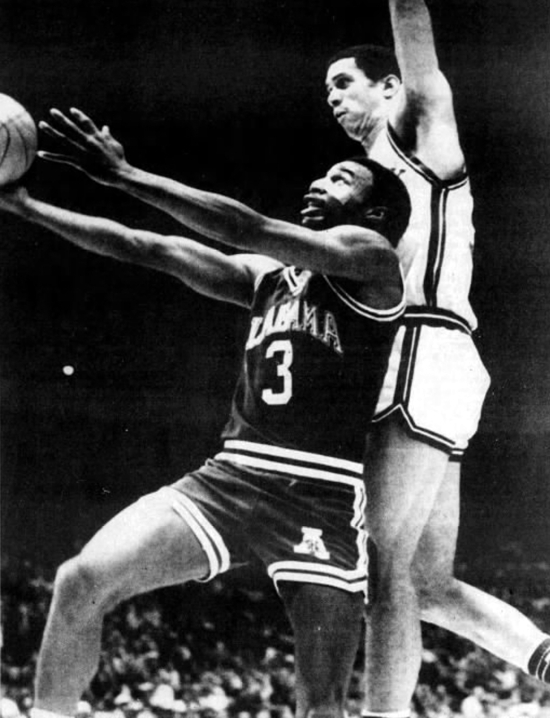 Alabama guard Ennis Whatley holds the ball while being fouled by Jim Master