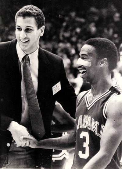 Injured Sam Bowie congratulates Alabama's Ennis Whatley (#3)
