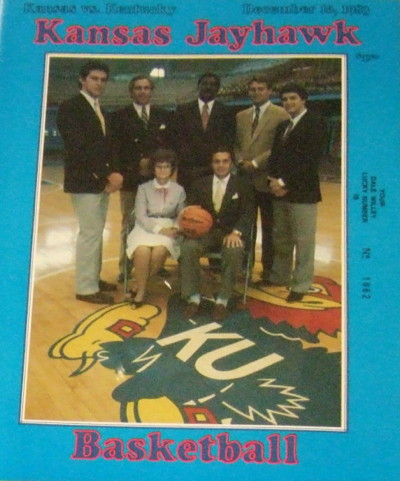 Kenny Walker (#34), Sam Bowie and Melvin Turpin all rise to block the shot of Kansas 7-footer Greg Dreiling (#30)