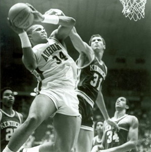Sam Bowie (#31) fouls Auburn's Charles Barkley (#34)