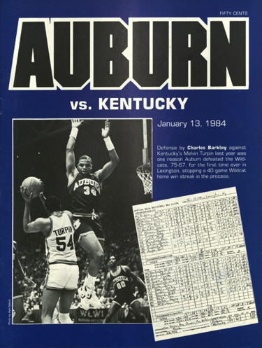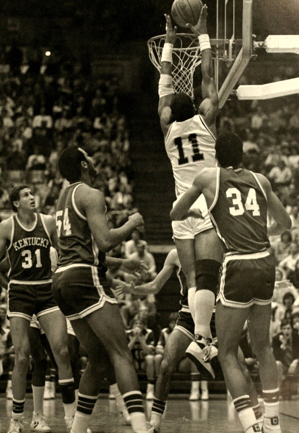 Auburn's Greg Turner (#11) scores inside of Kentucky front-line of Sam Bowie (#31), Melvin Turpin (#54) and Kenny Walker (#34)