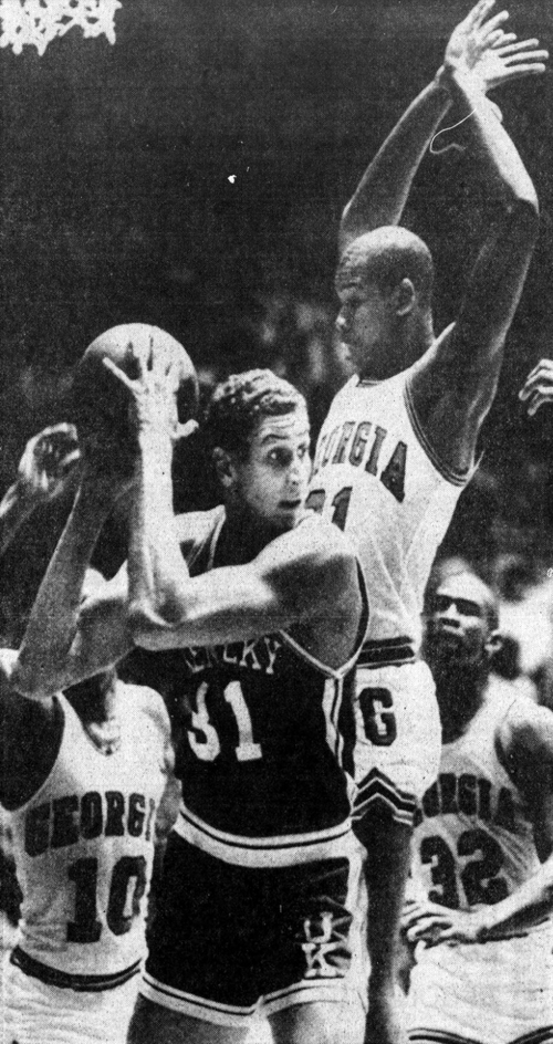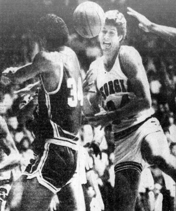 Sam Bowie (#31) looks to pass while defended by Georgia's Vern Fleming (#10), Richard Corhen and Joe Ward (#32)