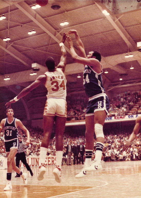 Melvin Turpin (#54) shoots over Tennessee's Rob Jones (#34) while Sam Bowie (#31) looks on [Photo courtesy of Jamie Vaught]
