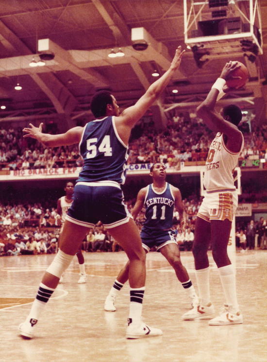 Melvin Turpin (#54) and Dicky Beal (#11) defend against Tennessee's Tyrone Beaman (#10) [Photo courtesy of Jamie Vaught]