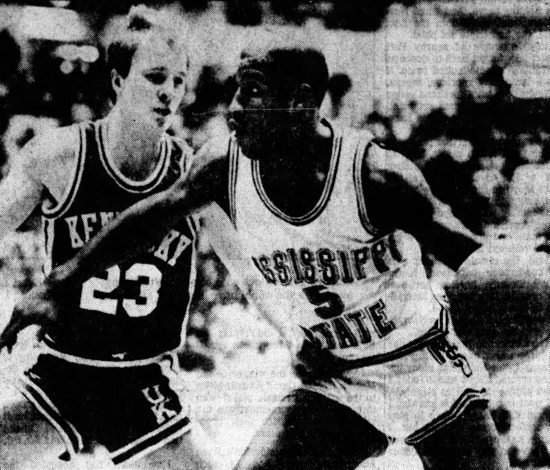 Roger Harden (#23) defends against Mississippi State's Ken Harvey (#5)