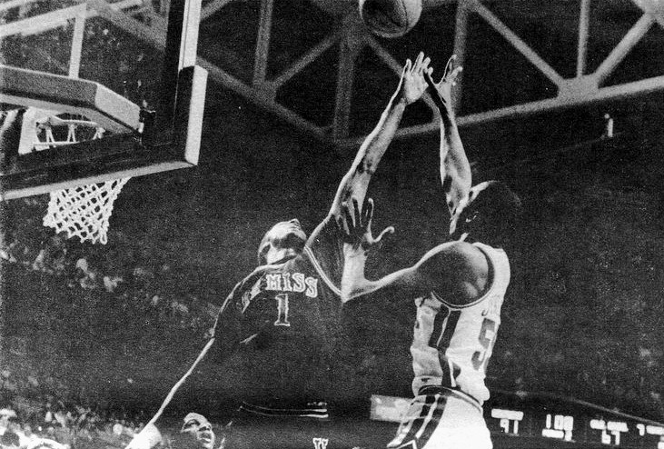 Cedric Jenkins (#55) lifts a shot over Ole Miss' Joe Ayers (#31)