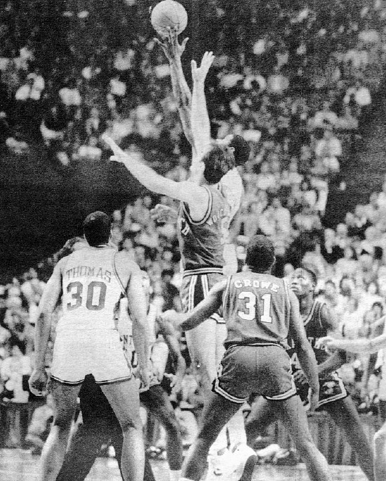 Richard Madison and Kent Wojciechoski tip off while Irving Thomas (#30) and Greg Crowe (#31) look on