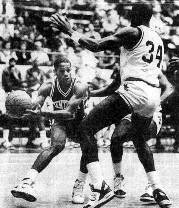 Ed Davender (#15) scores ahead of MSU's Greg Lockhart (#15)