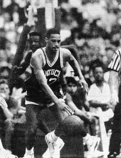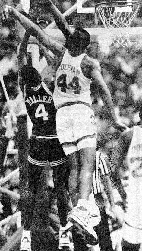 Derrick Miller (#4) challenges Derrick Coleman (#44) and another Syracuse defender inside