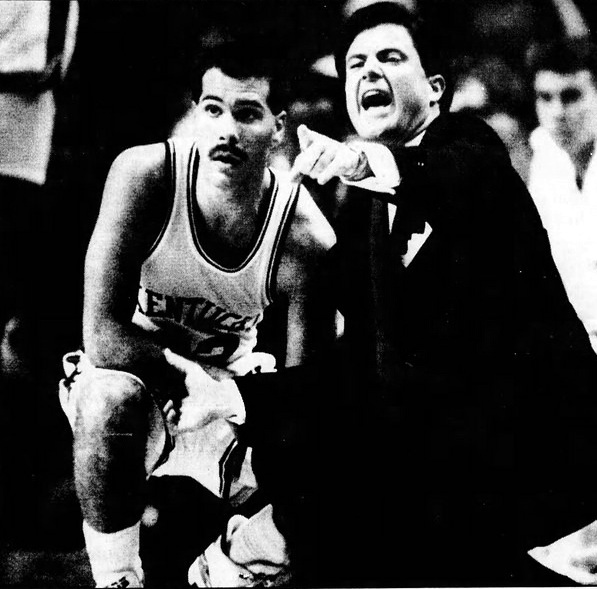 Rick Pitino yells instructions next to Richie Farmer