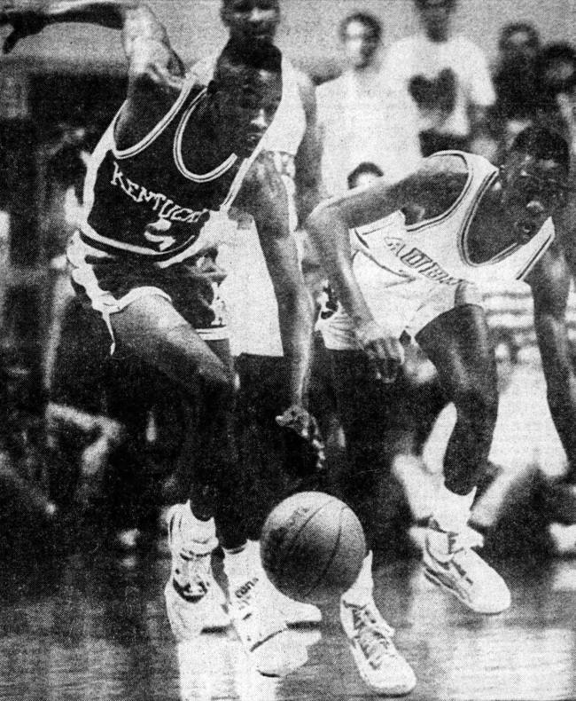 Derrick Miller beats Auburn's Larry Patrick to the ball