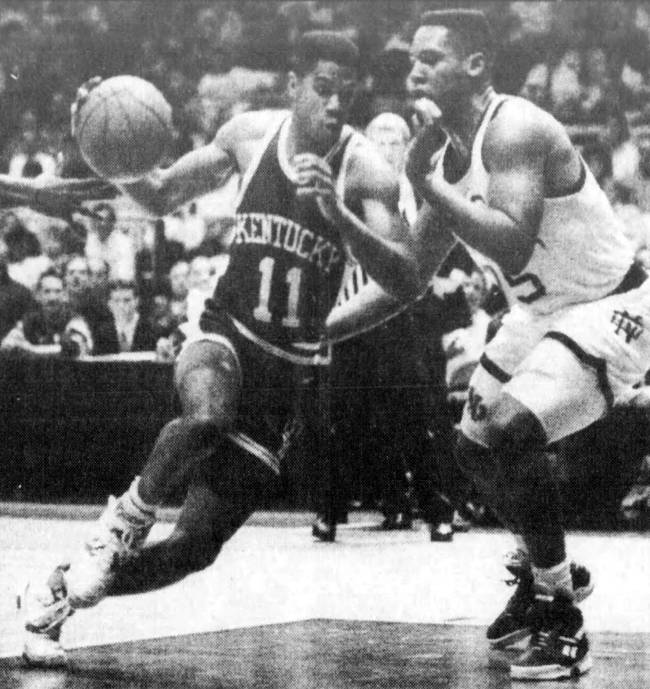 Sean Woods (#11) drives past Notre Dame's Kevin Ellery
